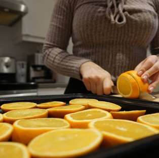 Cut oranges in thin slices (do as I say, not as I do- I had to cook them twice as long because they were never quite dry/too juicy!).